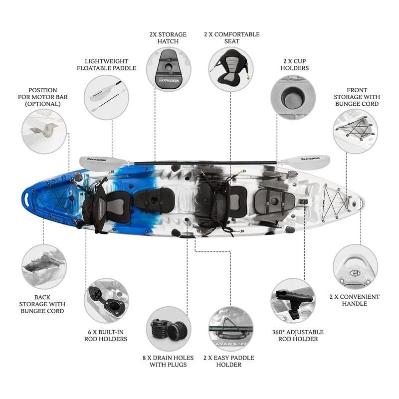 - Scupper holes with drain plugs around the body of Kayak for easy drainage if needed.