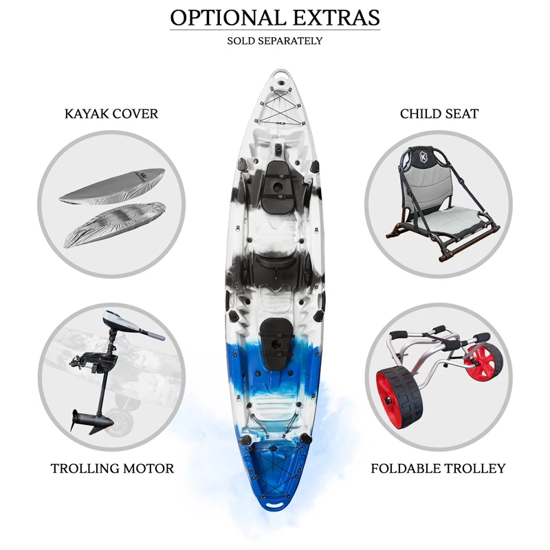 - Built-in third child seat position in the middle of the kayak. Kayak accommodates two adults + a child. The middle seat can also be used when Kayak is used by a single person*. (Please note padded seat for the child is not included. It can be purchased at an extra cost).