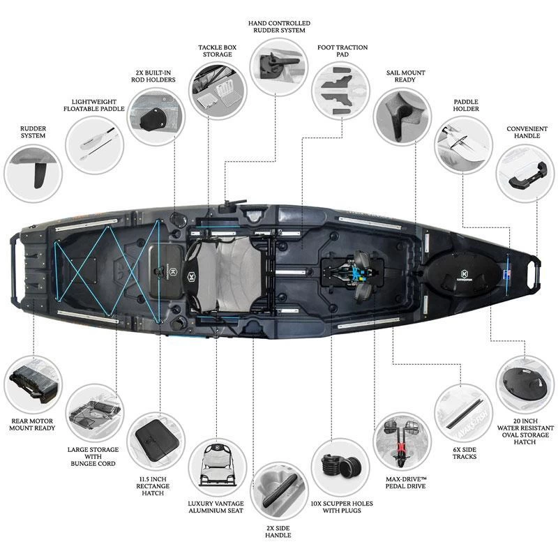 The Max-Drive™ Pedal drive allows fast but smooth-and-easy pedal acceleration and stopping; whether travelling long distances between fishing spots or for nuanced kayak positioning while sneaking up on the big ones. Lightweight premium pedal power is at your back and call to hit every one of your secret spots and then get home quick against wind and tides.
