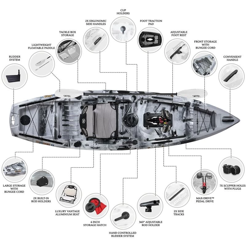 The Max-Drive™ Pedal drive allows fast but smooth-and-easy pedal acceleration and stopping; whether travelling long distances between fishing spots or for nuanced kayak positioning while sneaking up on the big ones. Lightweight premium pedal power is at your back and call to hit every one of your secret spots and then get home quick against wind and tides.