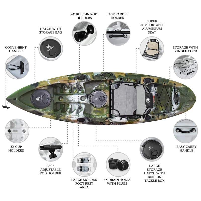 - 2x Storage Hatch (Front 9″ & Middle 8″ with Built-in Tackle Box)