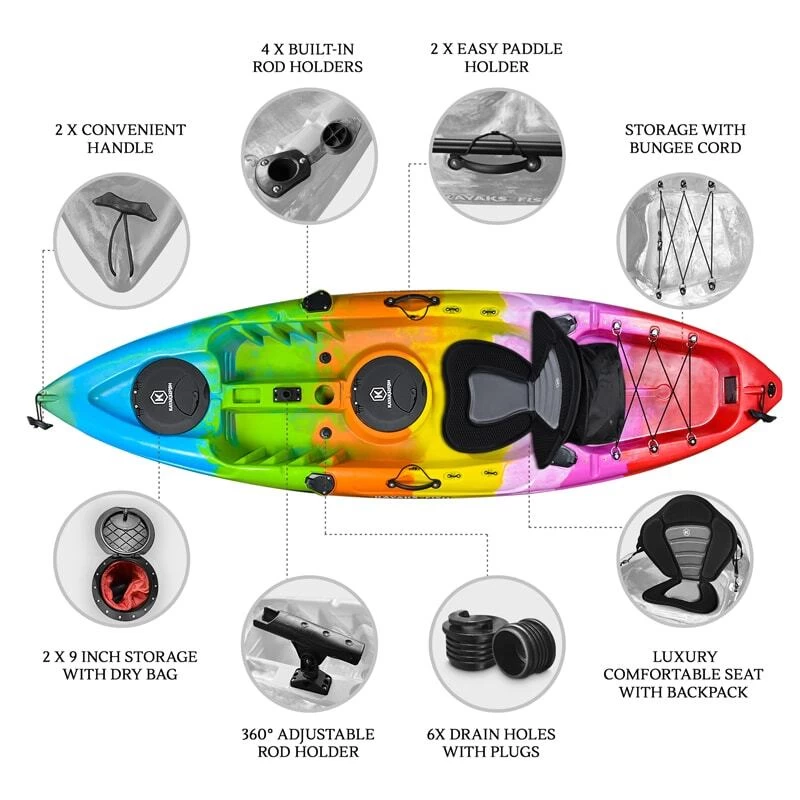 - Six scupper holes with drain plugs around the body of Kayak for easy drainage if needed.